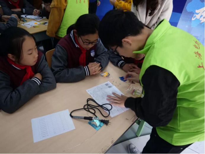 愉快學(xué)習(xí)的時間總是過得很快,不知不覺就到了最后一個環(huán)節(jié):電焊無人小車和DIY制作小課堂。臨外的學(xué)生們躍躍欲試,積極參與到動手操作中。在我校志愿者們的幫助下,大家合作把一個個零件組裝、焊接成了一輛輛小車、會動的機(jī)器人、自動發(fā)球機(jī)等作品,看著臨外學(xué)生們滿足的笑容,志愿者們也很有成就感。