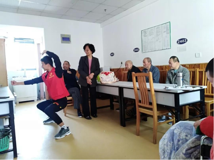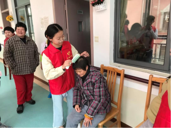 之后開始了此次活動的第二個項目---走進床邊看望老人。志愿者們分別前往養(yǎng)護院的2樓、3樓、4樓、5樓看望老人,有主動為老人梳頭發(fā)的,有主動給老人表演打拳的,也有跟老人暢談人生的,屋子里頓時充滿歡聲笑語,老人對于志愿者們的到來很是開心。