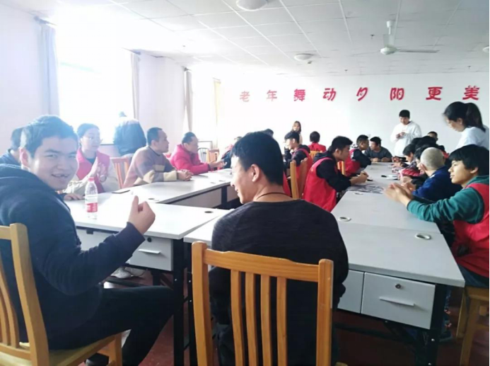 午飯之后,下午1點,志愿者們與老人展開了“一對一教學”活動,與他們一起搭積木,教他們寫書法,給他們表演節(jié)目,每個人臉上都洋溢著幸福的笑容。大家一起合唱了“精忠報國”、“最炫民族風”等經典曲目。