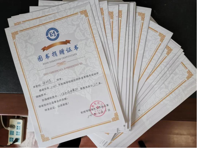 為感謝同學(xué)們對(duì)畢業(yè)季捐書(shū)活動(dòng)的支持,學(xué)院給每位捐書(shū)的同學(xué)頒發(fā)了捐贈(zèng)證書(shū),相信這些書(shū)籍能給低年級(jí)學(xué)生起到很大的幫助。