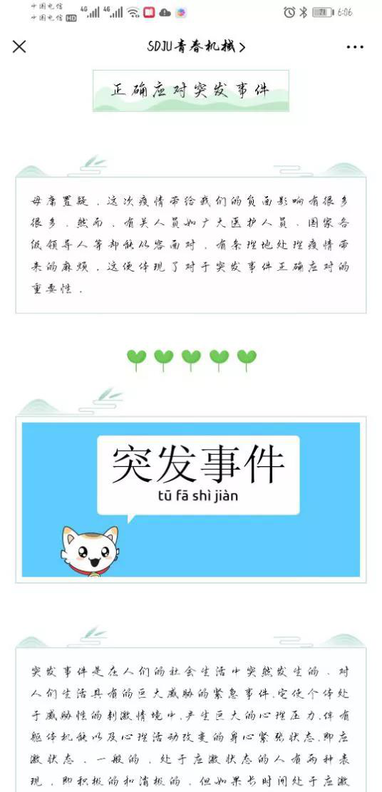 在“抗疫心理”科普宣教方面,學(xué)生工作條線教師參加全國高校輔導(dǎo)員網(wǎng)絡(luò)培訓(xùn)師范班的學(xué)習(xí),了解疫情期間的自我心理防范、抗擊新型冠裝肺炎中的心理應(yīng)對、公共衛(wèi)生事件保護等知識,并通過學(xué)院公眾號、微信、qq等對學(xué)生進行宣傳指導(dǎo);同時學(xué)院努力普及心理健康相關(guān)知識,在微信公眾號sdju青春機械上以每周一次的頻率發(fā)布推文,以緩解學(xué)生心理壓力,引導(dǎo)學(xué)生用正確的心態(tài)面對此次疫情給學(xué)習(xí)生活的帶來的沖擊和挑戰(zhàn)。專題推文種類不一,包括學(xué)院志愿者參與一線共抗疫情、與心理健康相關(guān)的書籍推送、疫情期間的癥狀科普和應(yīng)急方法等豐富內(nèi)容。