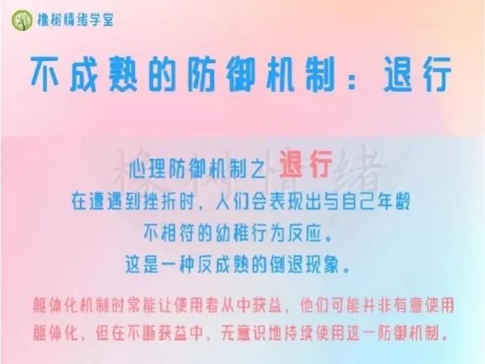 1.退行:退行就是人的一種心理防御機(jī)制,指的是當(dāng)人們遇到挫折的時(shí)候,放棄已經(jīng)習(xí)慣了的成人方式,恢復(fù)使用個(gè)體早年時(shí)期的行為方式來逃避現(xiàn)實(shí)。