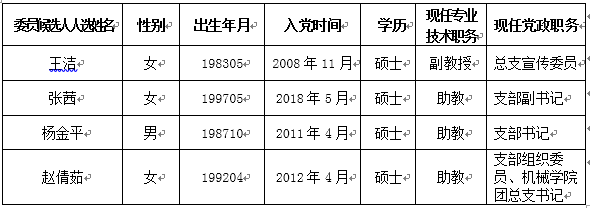 根據(jù)《中國共產(chǎn)黨章程》和《中國共產(chǎn)黨普通高等學(xué)校基層組織工作條例》的有關(guān)規(guī)定,機(jī)械學(xué)院黨總支第六黨支部經(jīng)過支委會(huì)討論、黨員提名等形式進(jìn)行充分醞釀,初步產(chǎn)生了4名委員候選人。現(xiàn)將產(chǎn)生的支部委員候選人(以姓氏筆畫排序)予以公示,廣泛聽取黨員群眾意見。