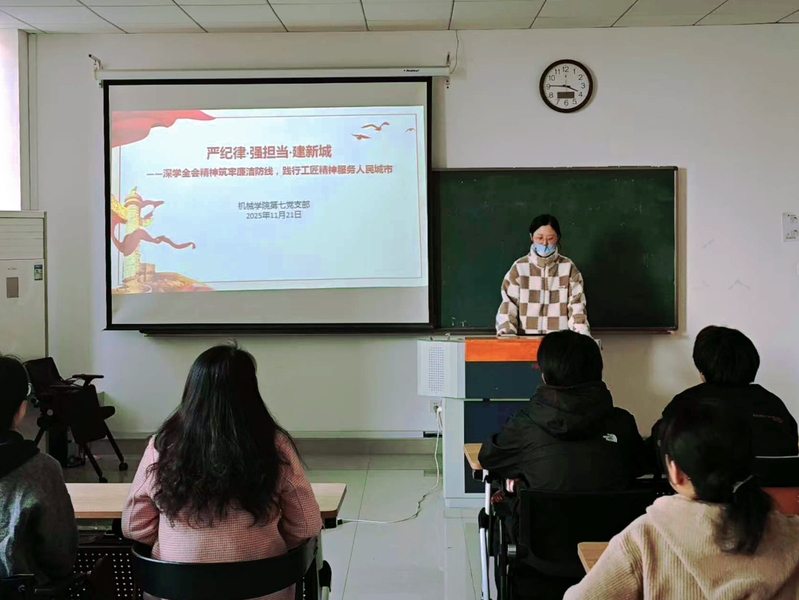 為深入學(xué)習(xí)貫徹黨的二十屆四中全會(huì)精神,進(jìn)一步增強(qiáng)學(xué)生黨員的紀(jì)律意識(shí)和擔(dān)當(dāng)精神,2025年11月21日下午,機(jī)械學(xué)院第七黨支部組織全體黨員和入黨積極分子開(kāi)展了“嚴(yán)紀(jì)律·強(qiáng)擔(dān)當(dāng)·建新城”主題黨日活動(dòng)。活動(dòng)分為理論領(lǐng)學(xué)、光影印證和思辨踐行三個(gè)環(huán)節(jié),內(nèi)容豐富、形式多樣,取得了良好成效。